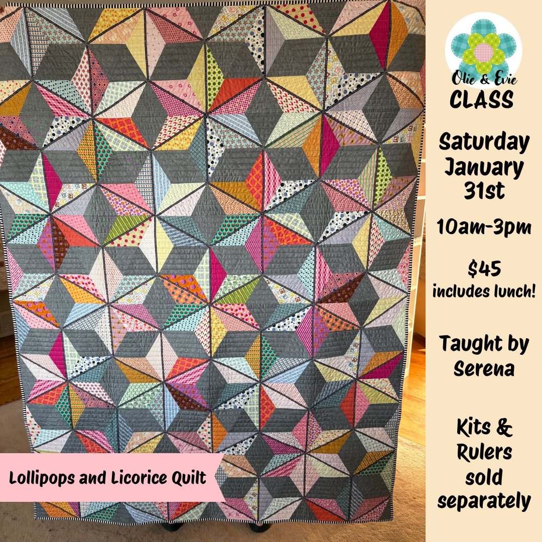 Olie & Evie Class! Our awesome Serena will be teaching you how to make the Lollipops and Licorice Quilt by Krista Moser of The Quilted Life. To make this darling quilt, you will cut diamonds and triangles with the Creative Grids 60-Degree Diamond Mini Ruler.