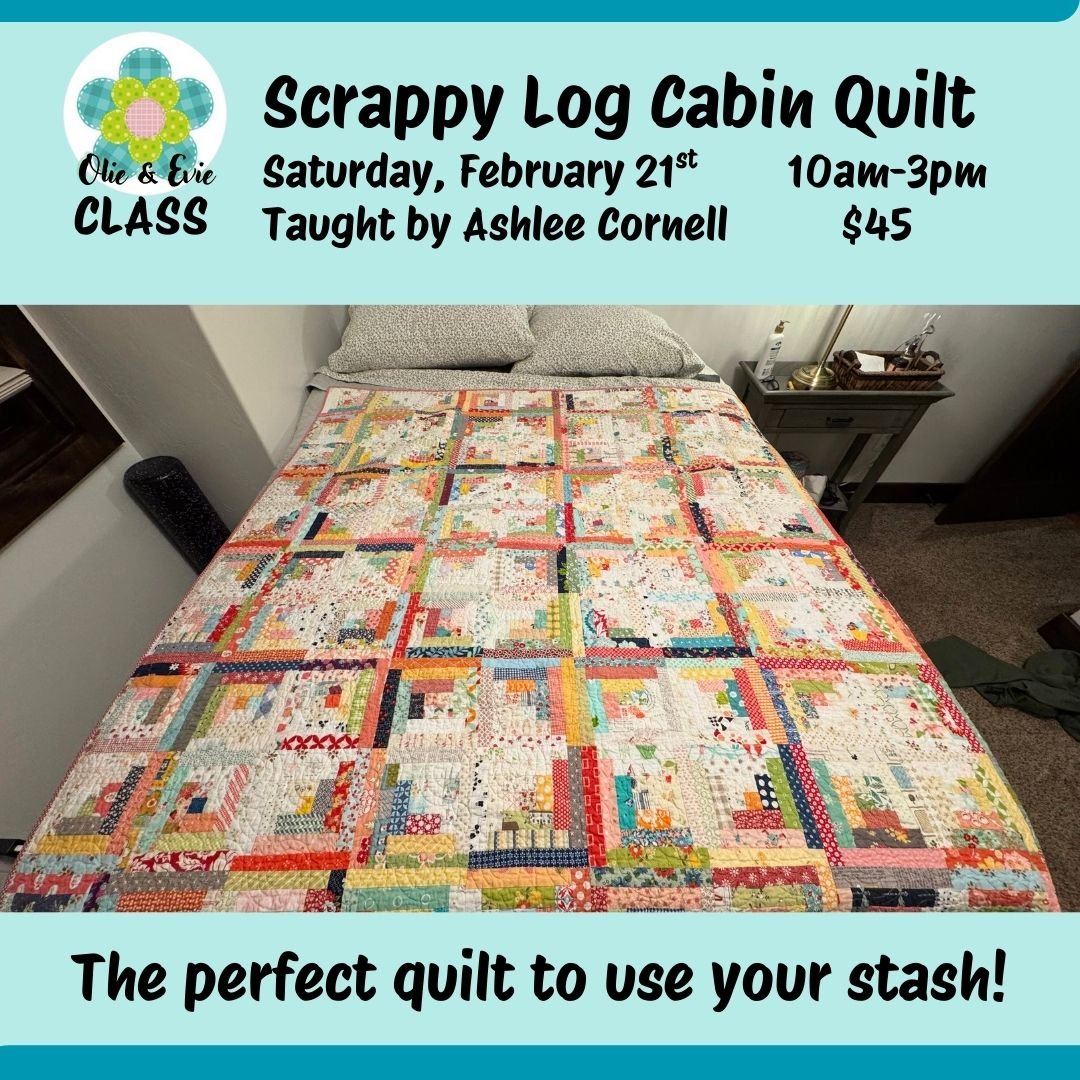 All you need to do is gather your large & small scraps, get the Block Loc Log Cabin Ruler (available at the Olie & Evie Quilt Shop) and register on the website, olieandevie.com. This class is taught by the very talented Ashlee Cornell from 10am-3pm on Saturday, February 21, in the Olie & Evie Classroom at the shop. The cost is $45 and includes a delicious lunch provided by Rhonda.